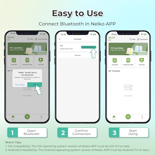 • Easy to Use: NELKO label printer compatible with IOS & Android Phone via bluetooth connection. Step 1: Download “Nelko” APP from Google Play or App Store. Step 2: Install the paper roll. Step 3: Connect the P21 bluetooth within APP. Step 4: Choose a quick template and start printing. It is not compatible with Google phones on Android 14. This label maker machine with tape APP included more than 90 +Fonts, 10+ Languages, 450+ Materials. (Note: This label maker doesn’t work with computers)